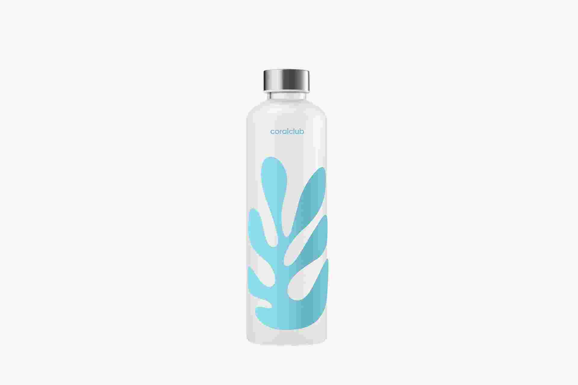 Boroszilikát üvegből készült vizes palack az évforduló mintájával, melyet a Coral Club 25. évfordulójára készítettek.