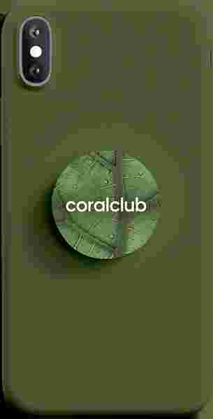 A Coral Club logóval ellátott Popsocket - összecsukható műanyag támaszték okostelefonok számára, ujjtámasz.